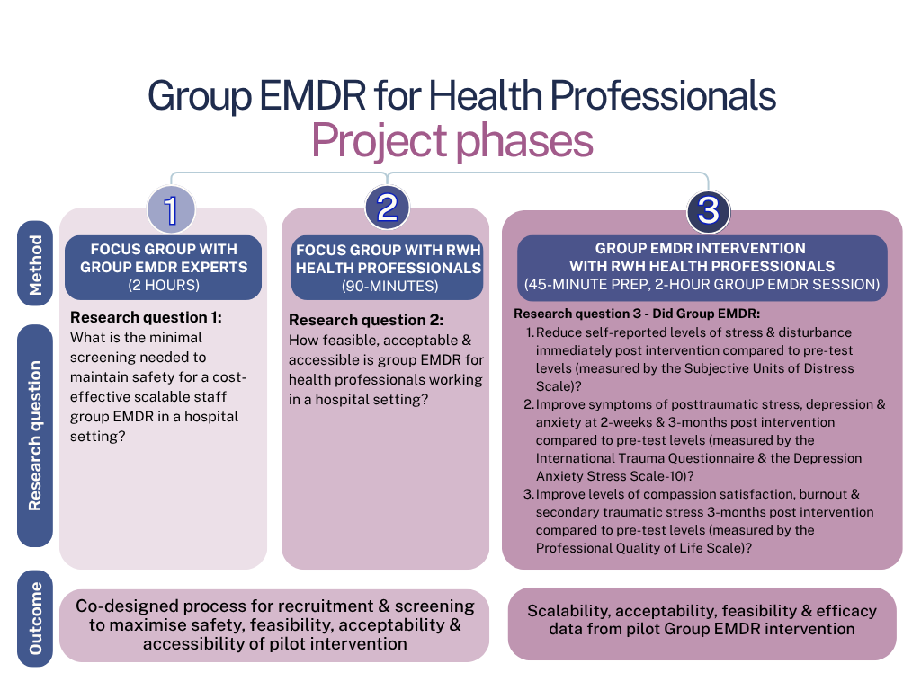 The aim of the project titled ‘Group EMDR for Health Professionals’ study is to effectively support health professionals exposed to distressing events, trauma and burnout at work. In this pilot study, we are testing a brief psychological group treatment called Group Eye Movement Desensitization Reprocessing Therapy (EMDR) with health professionals at the Royal Women’s Hospital, Victoria (RWH).